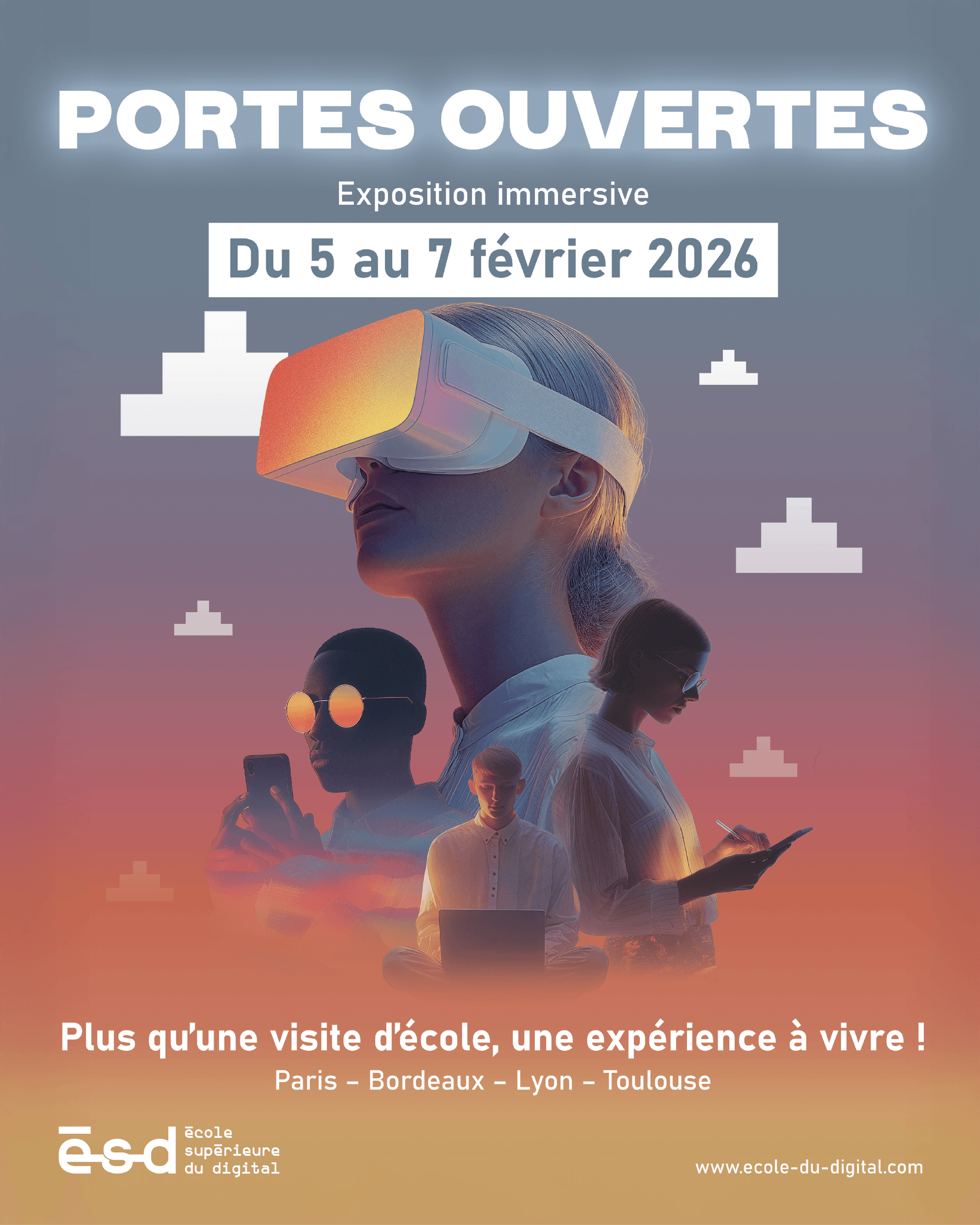 Du 5 au 7 février 2026, l’École Supérieure du Digital (ESD) propose des portes ouvertes immersives autour du cinéma, à travers une exposition présentant les créations imaginées et réalisées par ses étudiants en deux semaines dans le cadre du Digital Event, l’événement phare de l’école. Pendant trois jours, les campus de Paris, Lyon, Bordeaux et Toulouse se transforment en exposition grandeur nature, avec des expériences interactives à découvrir et à tester sur place.