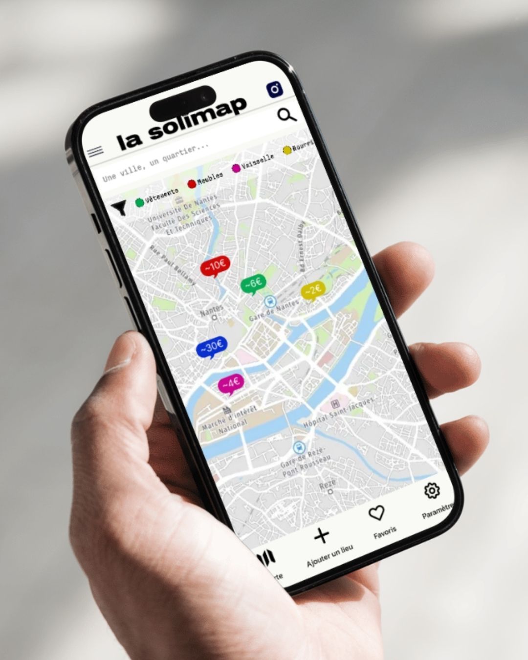 - filtrer les adresses par catégorie (vêtements, meubles, alimentation…)
